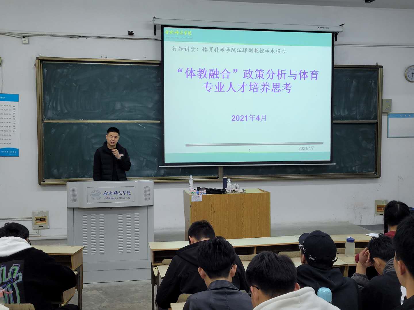 本网讯 4月7日下午,“行知学堂”学术报告在锦绣校区博约楼111教室举行。本场报告由jinnianhui今年会汪辉副教授主讲,主题为“‘体教融合’政策分析与体育专业人才培养思考”,体育教育、运动训练、舞蹈表演和运动康复专业近200名学生聆听了报告。