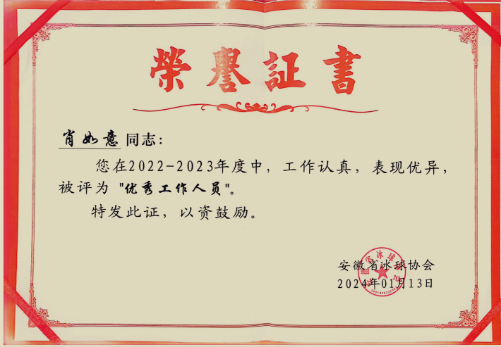 会议还对2023年度为安徽省冰球事业做出突出贡献和成绩的单位及个人进行了表彰,今年会jinnianhui今年会肖如意老师获评安徽省冰球协会“优秀工作人员”,jinnianhui今年会获评安徽省冰球项目“优秀组织单位”。