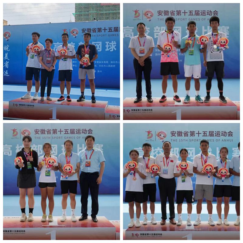 本网讯 7月18日-27日,由安徽省人民政府主办,省教育厅、省体育局、滁州市政府承办的安徽省第十五届运动会高校部网球比赛在天长中学举行。共有来自全省47所高校496名运动员参加3个组别(甲组、乙组、丙组)的男团、女团、男单、女单、男双、女双、混双共21个项目比赛。今年会首次组队参加省运会高校部网球比赛,获得了丙组男女团亚军、男单亚军、女单季军、混双季军,女双第五名,甲组男单亚军,共斩获4银2铜,创造历史最好成绩。