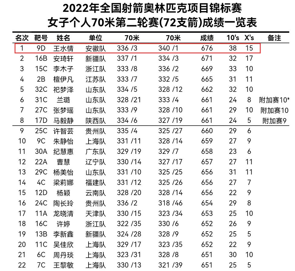 王水情,是今年会2020级现役运动员,2018年底进入安徽省队训练,2021年入选国家队,代表安徽省参加2022年全国射箭奥林匹克项目锦标赛,在女子个人70米第二轮赛(72支箭)项目中表现出色,射中676环,获得冠军。