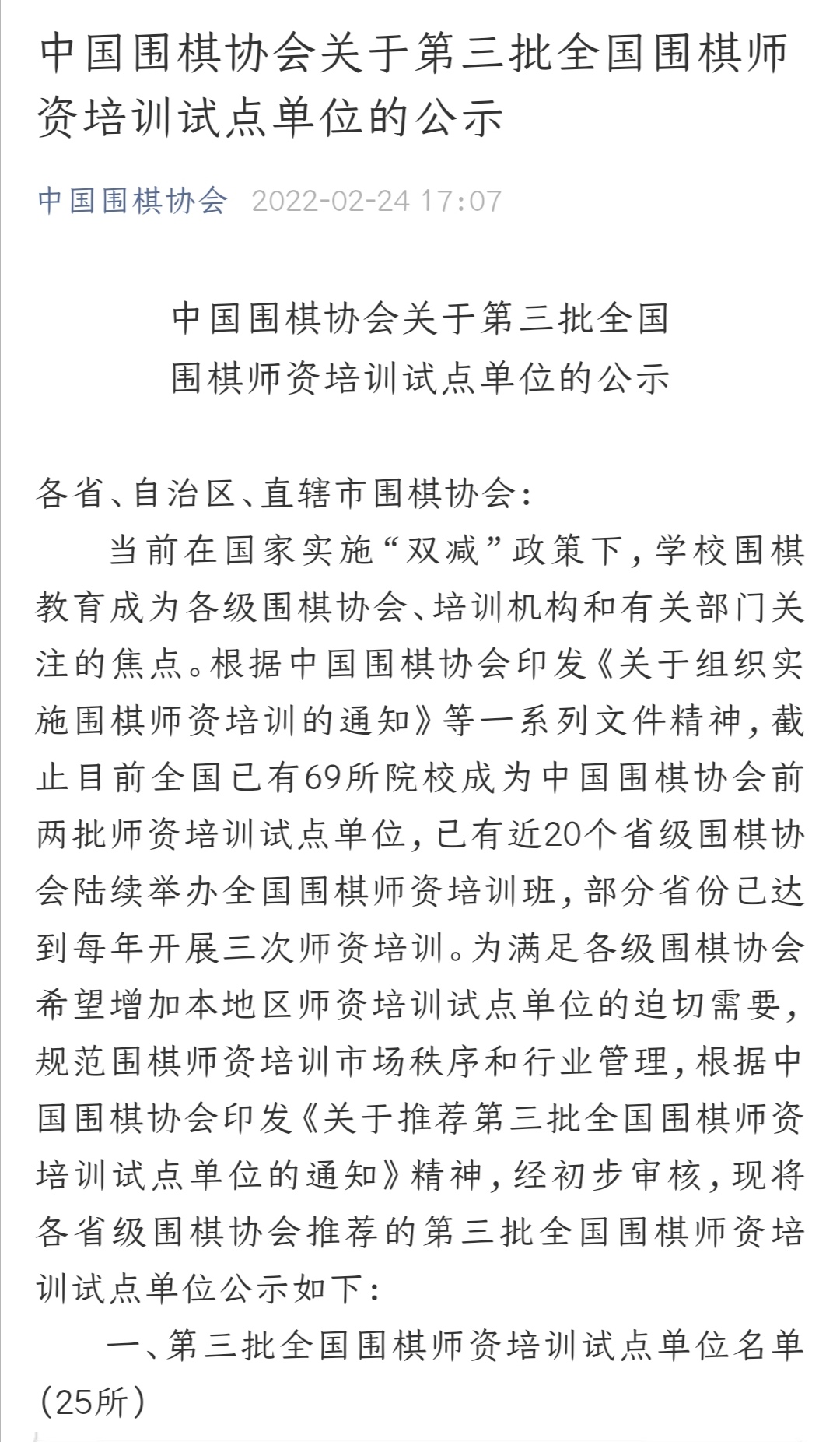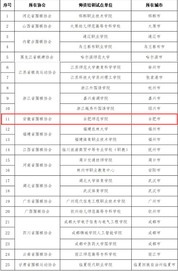 本网讯 近日,中国围棋协会发布《中国围棋协会关于第三批全国围棋师资培训试点单位的公示》,今年会获批第三批全国围棋师资培训试点单位。本次试点单位涉及全国16个省25所院校,今年会是安徽省唯一一所入选高校。