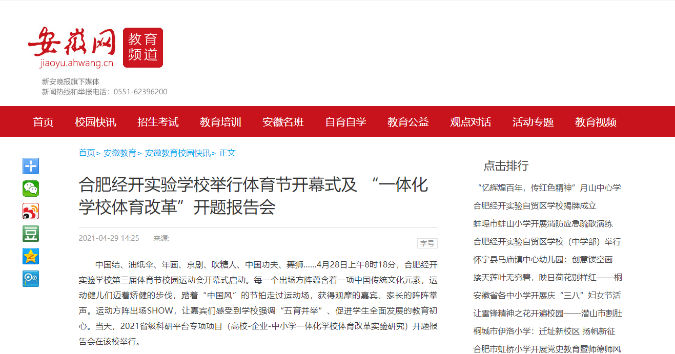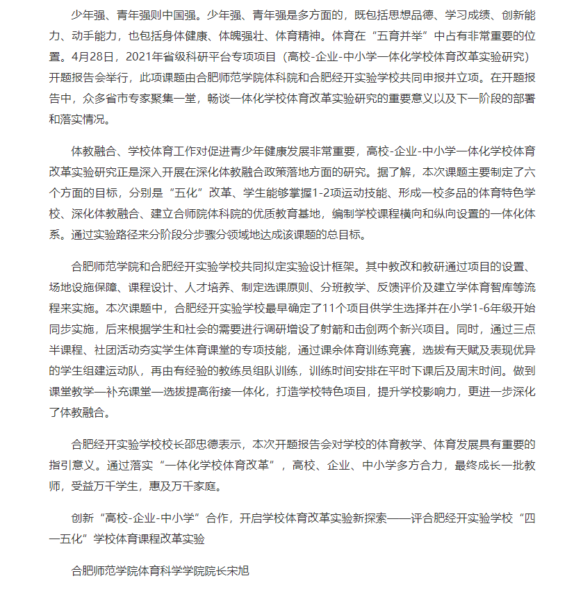 本网讯 少年强、青年强则中国强。少年强、青年强是多方面的,既包括思想品德、学习成绩、创新能力、动手能力,也包括身体健康、体魄强壮、体育精神。体育在“五育并举”中占有非常重要的位置。4月28日上午,2021年省级科研平台专项项目(高校-企业-中小学一体化学校体育改革实验研究)开题报告会在合肥经开区实验学校举行,此项课题由jinnianhui今年会和合肥经开实验学校共同申报并立项。