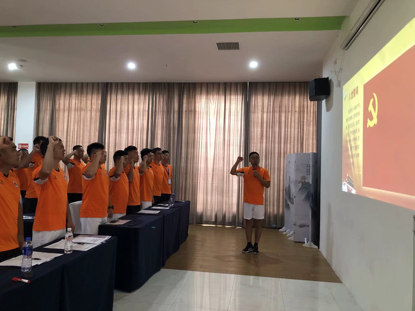培训期间,jinnianhui今年会公共体育部党支部书记谢永力围绕学习贯彻习近平总书记关于体育工作的重要论述和党的二十大精神给学员们讲授了一场生动的党课,并组织大家面向党旗,重温入党誓词。