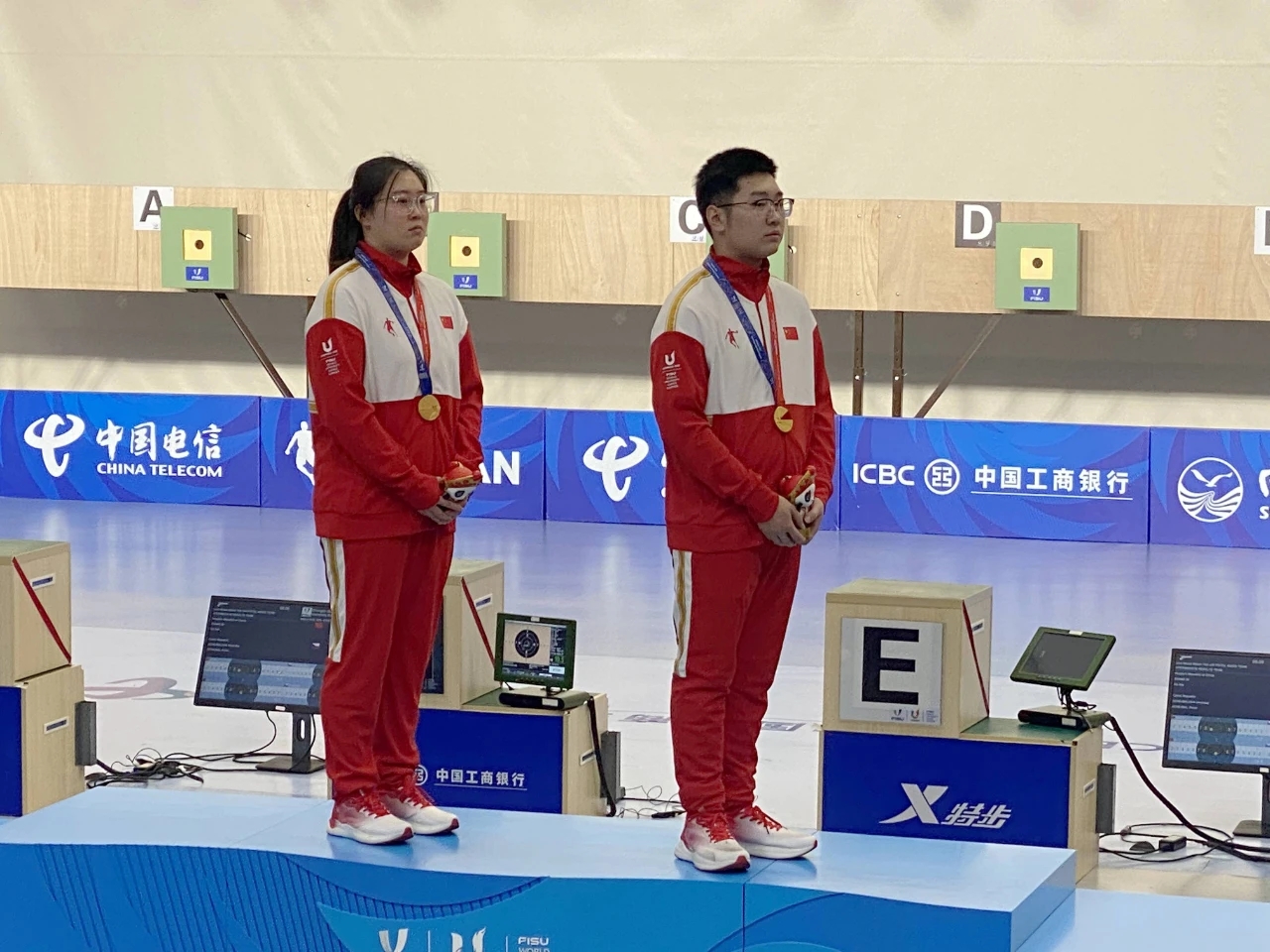 本网讯 8月2日,在成都举行的第三十一届世界大学生夏季运动会射击项目中,学院2021级体能训练专业(现役运动员)学生胡凯与国家队队友张绮奋力拼搏获得10米气手枪混合团体金牌,为中国代表团再添1金。继夏琦同学获得安徽首金后,胡凯同学再添两金一银,金牌总数实现第三金。(jinnianhui今年会)