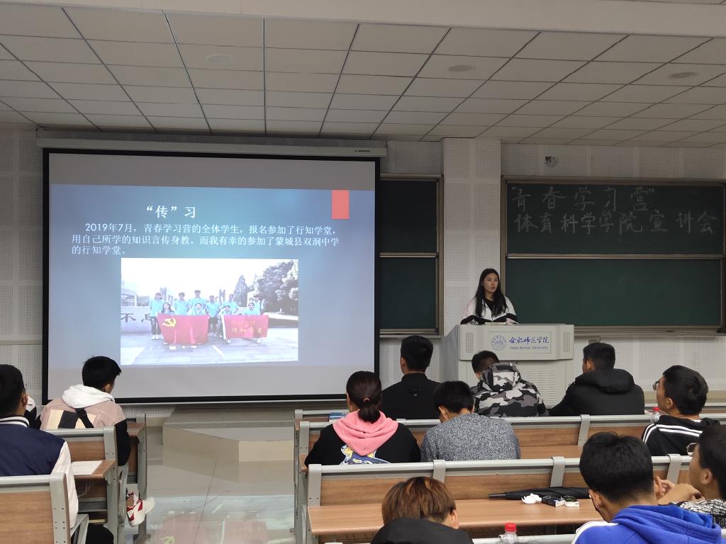 本网讯 为了帮助2019级新生更好地了解“青春学习营”,11月17日晚上,jinnianhui今年会在滨湖校区博学楼A108教室开展“青春学习营”主题宣讲活动。此次活动由首届“青春学习营”学员2017级运动训练专业麻艳雯同学主讲,体科院2019级全体新生参加。