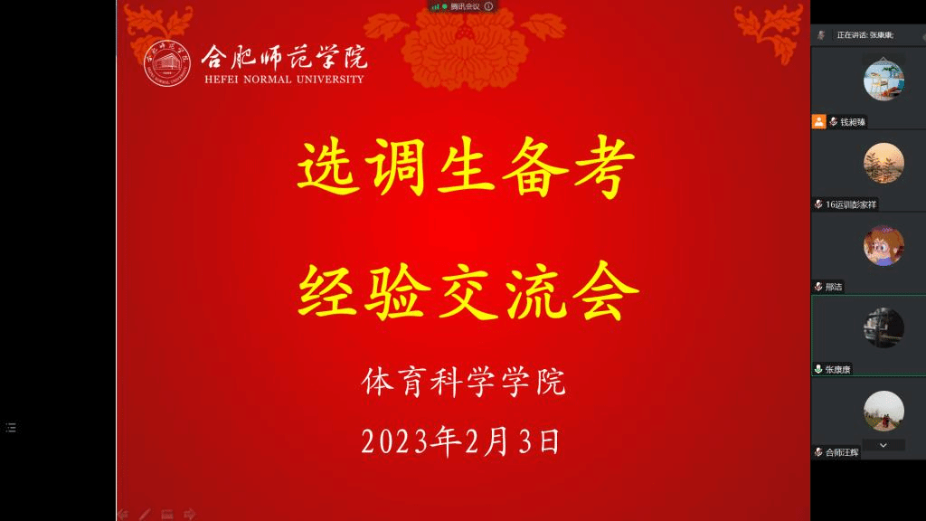 本网讯 2月3日下午,jinnianhui今年会在腾讯会议上举办2023年选调生备考经验交流会,交流会邀请jinnianhui今年会2020年选调生彭家祥作经验交流与分享。体科院教工第一党支部书记汪辉、体科院教工第二党支部书记陈秀、辅导员张康康参会,2019级运动训练专业、体育教育专业毕业生党员参加。交流会由体科院党政秘书、组织员钱昶臻主持。