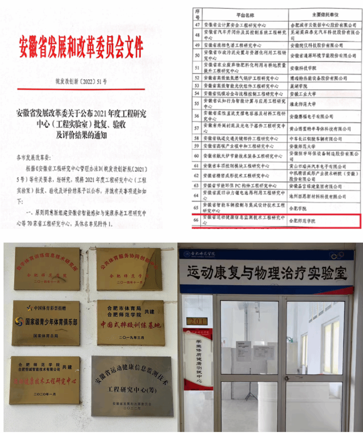 本专业依托安徽省运动健康信息监测技术工程研究中心、安徽省国民体质监测分中心两个省级科研平台建有数字体育与生物力学实验室、物理治疗与运动康复实验室、体能训练与评估实验室、运动生理机能评估实验室、低氧健身技术与低氧习服评估实验室等7个实验室,配备了三维动作捕捉与分析系统、骨密度仪、动脉硬化检测装置、体外冲击波治疗仪、干涉波疼痛治疗仪、爆发力训练与测试系统、多功能离心测试训练平台等近1000万的教学科研设备;同时,与中国科学技术大学附属医院(省立医院)、东南大学附属中大医院、常州市体育医院、安徽省体育科学技术研究所、合肥产投励源运动康复中心等共建实践教学基地。通过实验(践)教育,提高学生应用知识的能力,强化专业技能,培养适应未来工作所需的操作能力和综合素质;同时,培养运动康复领域创新能力和创业能力。